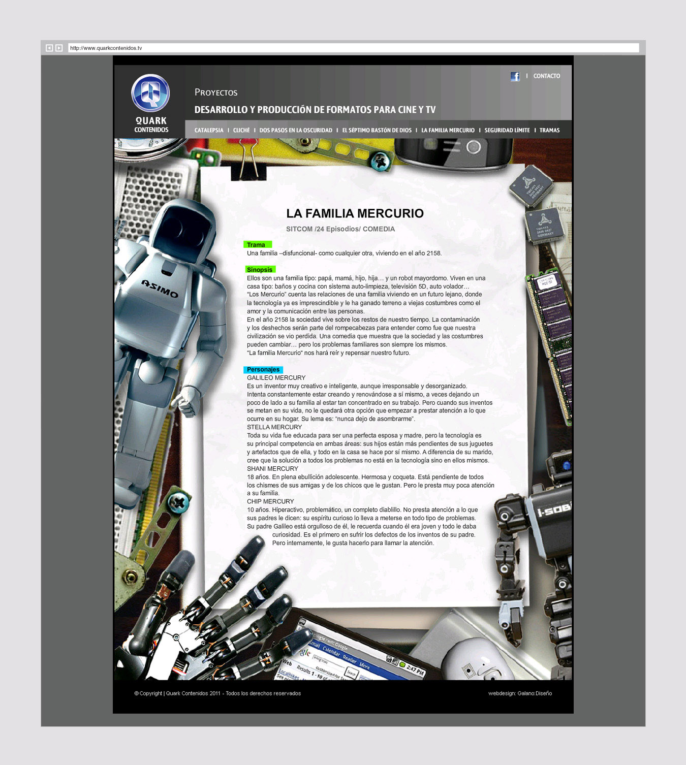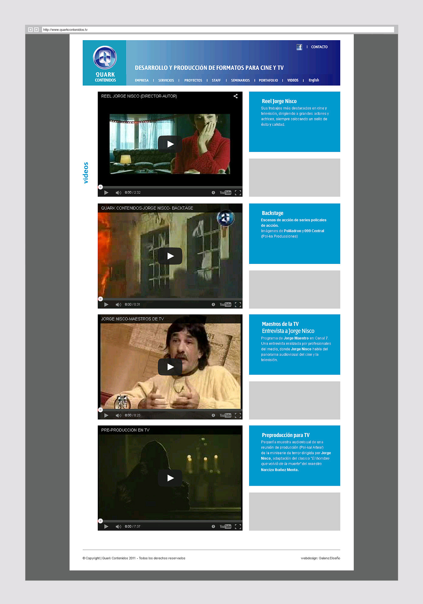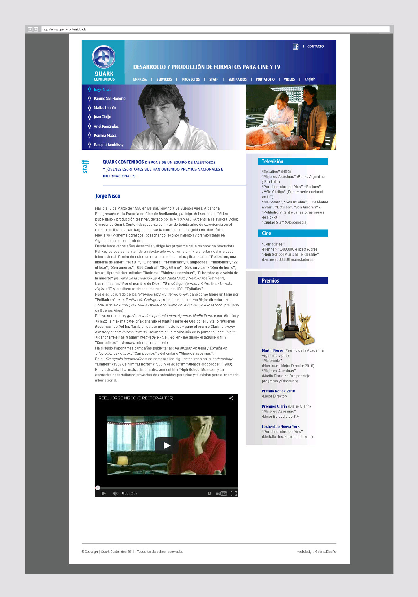 Integrada en su mayoría por guionistas, esta productora presenta sus servicios, trabajos y antecedentes. Un micrositio expone los guiones comercializables.